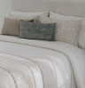 Un ensemble couvre-lit et housses de coussins habillé de bandes unies et de petits feuillages, le tout décliné dans des tons de lin et de blanc cassé. La partie basse du couvre-lit est tissée de feuillages coloris blanc cassé sur fond lin. Le milieu comporte une bande blanc cassé légèrement brillante puis une bande en velours coloris gris crème. La partie haute est unie blanc cassé. Matelassage 180g/m². Piquage lignes horizontales. Livré avec 2 housses de coussins habillées de petites feuilles coloris blanc cassé sur fond lin, dim 40x60cm. Couvre lit agrémenté d’une jolie finition biais blanc cassé sur le pourtour. Coins arrondis. Fabrication espagnole.