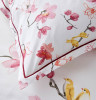 Faites entrer le printemps dans votre chambre avec cette parure de lit en percale imprimée de fleurs et d'oiseaux déclinés dans des tons de rose, d'orangé, de jaune et de noir sur fond blanc. En percale de coton peigné 80 fils/cm², tissage très fin et très serré. Ultra douceur. Fabrication française (Cambrai).